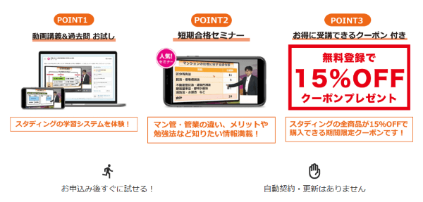 スタディング | 4.8 | 75名合格 (令和6年度) | 35,000円 | スマホ一つでどこでも学習 | AIが学習をサポート | 通信のみ |